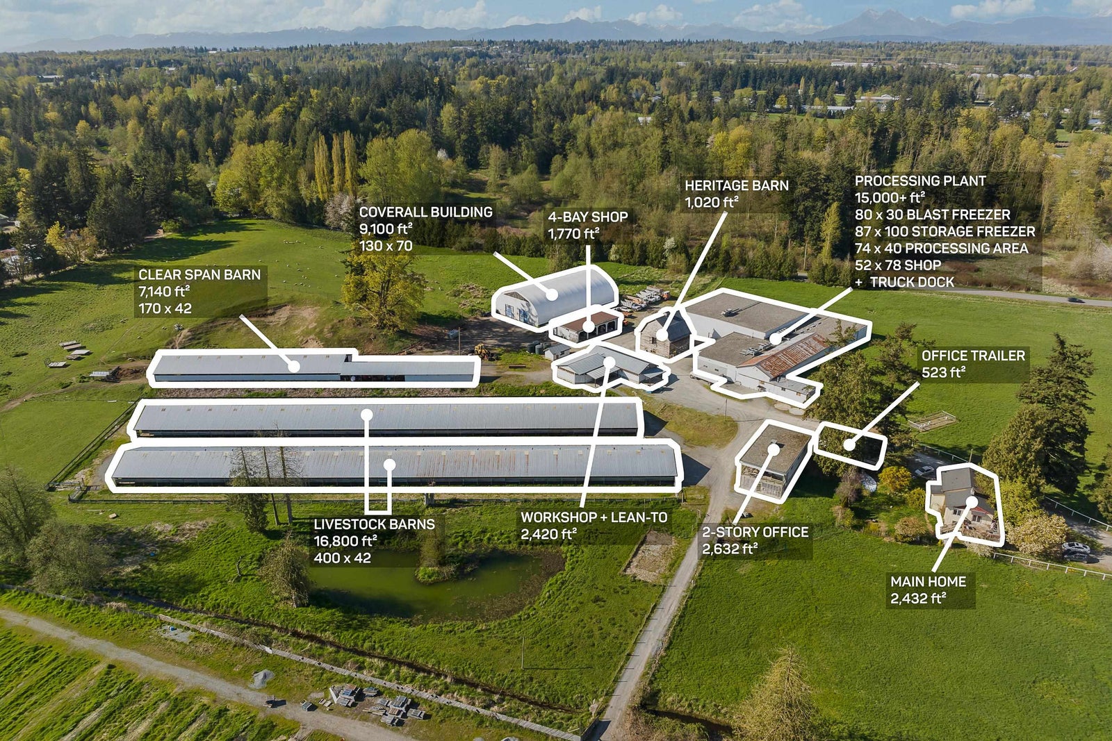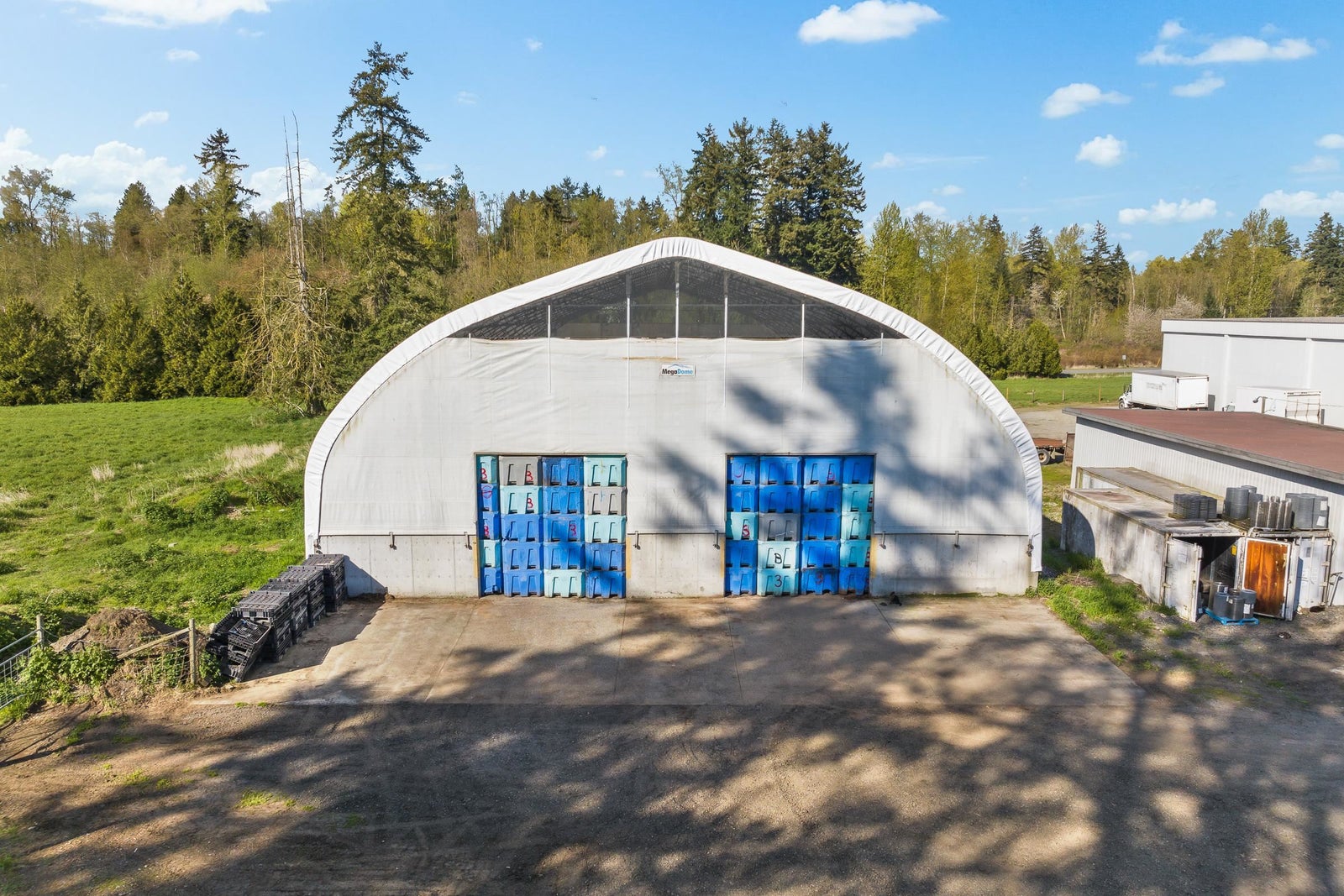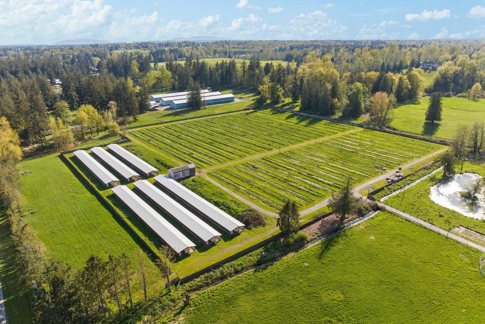 Tons of opportunity lay on this extraordinary 55.55 acre parcel in South Langley with two road frontages. 3 phase power a large Cold Storage facility containing an approx. 15,000sqft Processing plant , 80x30 blast freezer, 87x100 cold storage freezer, 52x78 shop & truck loading dock. Back up generator system. Updated engineered septic system. 2632 sqft office building with lunchroom w/kitchens, changeroom/washrooms, boardroom. 523sqft Office trailer, 1770 sqft shop w/4 bays, 2420sqft workshop, 780 sqft storage barn, 170' 42' clear span barn and a 70x130 coverall storage. Plus many more buildings. Mt.Baker view with possibility to build your dream home. Check out the photos and video online.
